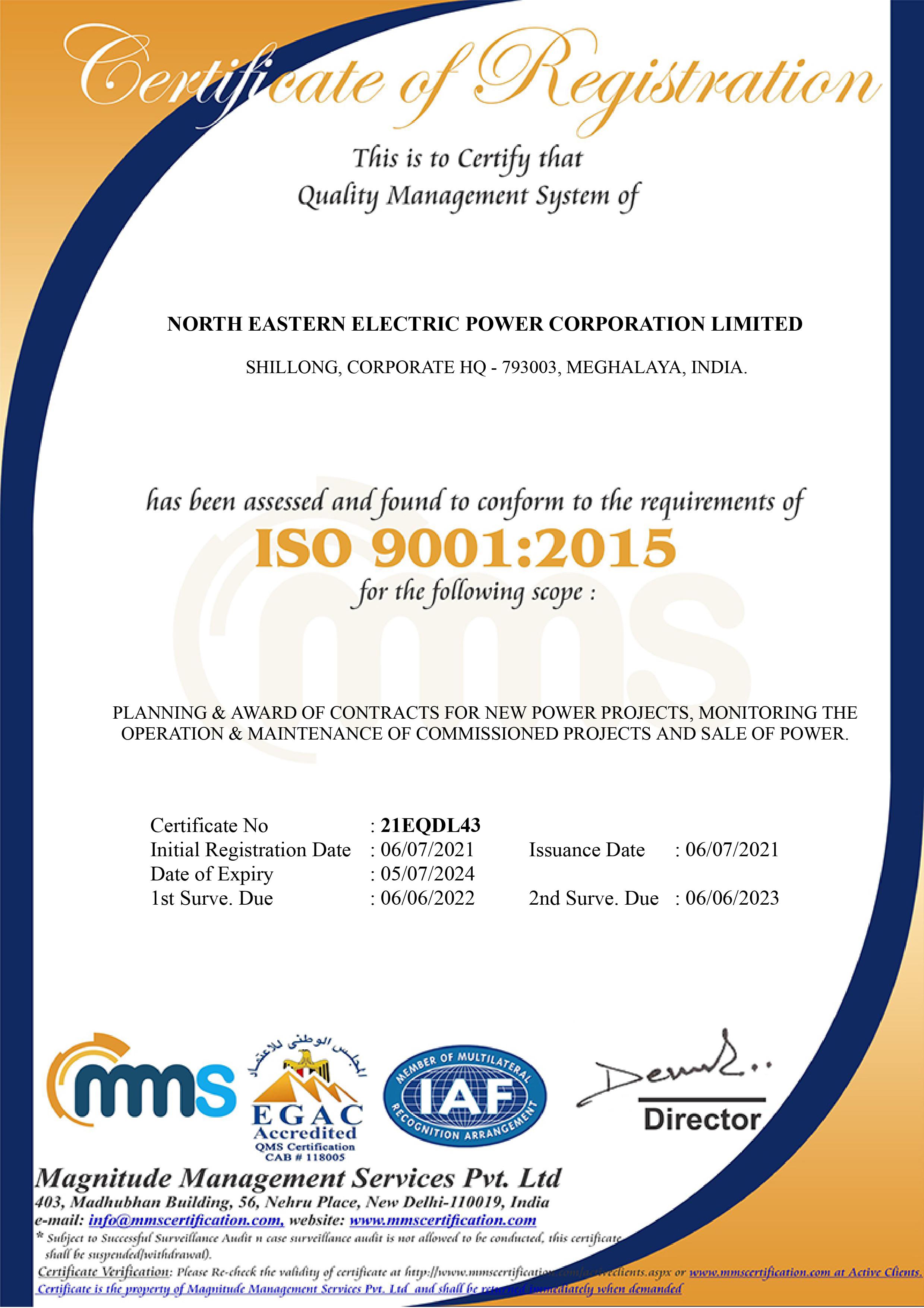 - आईएसओ 9001: 2015 गुणवत्ता प्रबंधन प्रणाली (क्यूएमएस))
