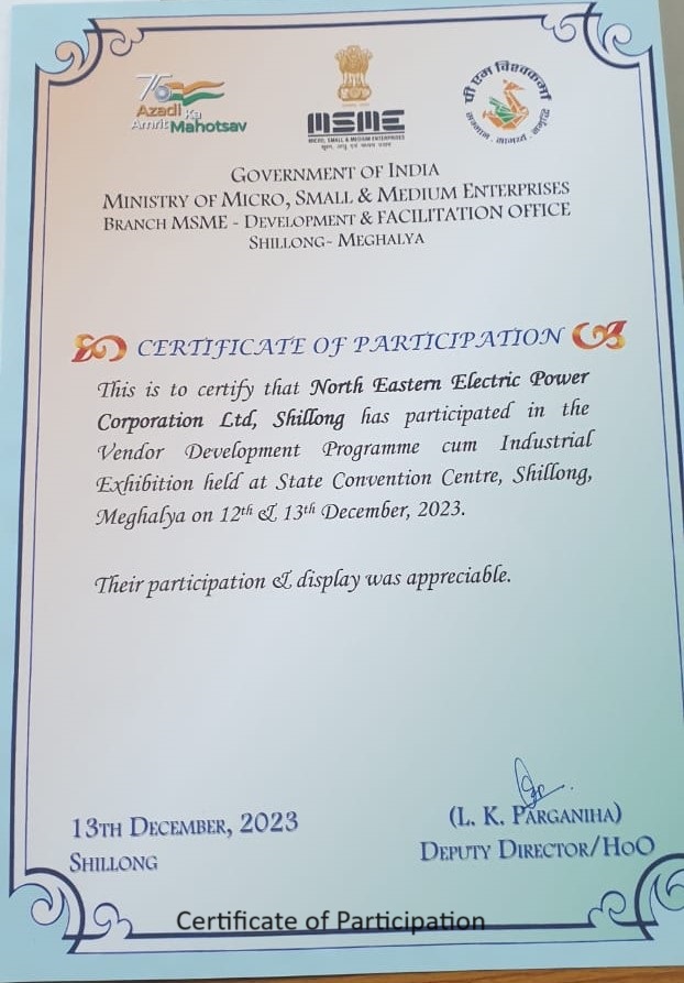 Ministry of Micro Small and Medium Enterprises , Govt of India has organized a VENDOR DEVELOPMENT PROGRAMME Cum INDUSTRIAL TRAINING on 12th and 13th December 2023 at Shillong. The event was sponsored by NEEPCO. Shri Dipankar Baruah , Chief General Manager, Contract & Procurement Wing, Shillong has presided the event as Chief Guest. Shri Nava Kamal Bora, DGM (C) has presented a presentation on Procurement procedures of NEEPCO.